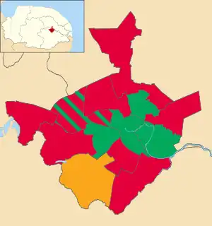 One third of the Norwich City Council in Norfolk, England is elected each year. Since the last boundary changes in 2019, 39 councillors have been elected from 13 wards.[4]