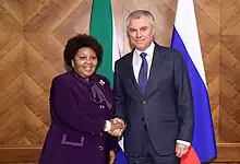 During her tenure as Speaker, she presided over several historic events in the sixth democratic Parliament, including the January 2022 fire at the Houses of Parliament[116][117] and moves to impeach Ramaphosa after the Phala Phala scandal; in the latter case, Mapisa-Nqakula denied opposition petitions to allow a secret ballot, and a motion to proceed with impeachment was defeated in December 2022.[118] She also presided over the National Assembly's response to the findings of the Zondo Commission, which implicated several members of the executive and legislature in serious misconduct and corruption;[119][120] in this connection, Siviwe Gwarube, the deputy chief whip of the DA, accused Mapisa-Nqakula of evasiveness and undue delay.[121] In March 2023, during the war in Ukraine, she led a delegation to a parliamentary conference in Moscow, Russia.[122]