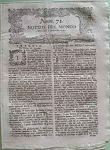 The first issue of Notizie del mondo of Venice was published on 28 November 1778.[4] It stated it was a reprint, with additions, of the newspaper with the same name published in Florence since 1768. Notizie del mondo of Venice had initially on its first page two dates, the date of Florence and the actual date of printing in Venice. The content was, however, completely independent from the Florence newspaper. From the first number of 1779, the Venetian Notizie del mondo left the graphic design of the Florentine Notizie del mondo. From the first number of 1785, the double dates were no longe used and, from issue 85 of the same year, the indication of being a reprint disappeared.[4]