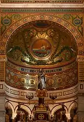 Following the death of Espérandieu on September 11, 1874, Henri Révoil was charged with finishing the interior of the basilica, in particular the mosaics. The construction of the major crypt and installation of the mosaics in the choir was carried out in 1882. Unfortunately a fire on June 5, 1884, destroyed the altar and the mosaic in the choir; moreover the statue of the Virgin was damaged. The statue and the mosaics were restored and the altar was rebuilt according to the drawings of Révoil. On April 26, 1886, cardinal Charles Lavigerie consecrated the new crypt.[59] In 1886, walnut stalls were built in the choir; the last mosaics in the side vaults were finished between 1887 and 1892. In 1897, the two bronze doors of the upper church and the mosaic above them were installed and the statue of the Virgin was regilded for the first time. Final completion of the basilica thus took place more than forty years after the first stone was laid.