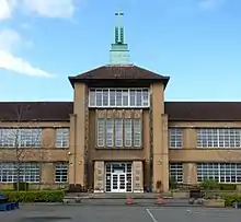 In 1894 Archbishop Eyre of Glasgow invited Mary Lescher and the Sisters of Notre Dame to come from the Mother House in Liverpool to establish a community in Glasgow.[2] The Notre Dame Training College was opened in 1893 at Dowanhill and began teaching in January 1895. In 1897 Notre Dame School was opened as a private secondary and Montessori school,[2] with a roll of 24 pupils, instructed by two teachers. By 1912, the number of pupils had risen to 193. Overcrowding led to proposals for a new building. This was designed by Thomas Cordiner in 1939, but due to the outbreak of war, construction was delayed, and the building opened in 1953. In 1987, the school was protected as a category A listed building.[3] At the same time as proposals to close the school were defeated.[4] The former high school building and adjoining primary school building and church were damaged in a fire on 12 June 2010.[5]