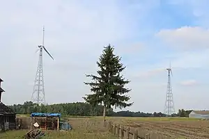 The Nowy Tomyśl Wind Turbines are wind turbines which used to be the tallest in the world.[1] They are situated in Paproć, a village near Nowy Tomyśl in Poland and were erected in 2012. Each of these two wind turbines has a generating capacity of 2500 kW. Both rotors have a diameter of 100 metres and are mounted on 160 metre tall free-standing lattice towers, which are the tallest free-standing lattice towers in Poland.