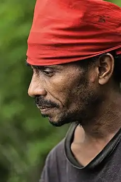 The Nuaulu people are often mistakenly referred to as the Manusela people, who like the Nuaulu people wear a traditional red cloth on their heads,[6] speak a similar language and practice the same traditional beliefs, the Naurus.[7]