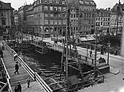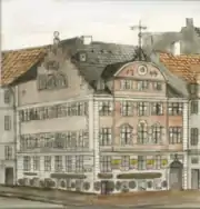 The corner building was constructed as a warehouse for skipper Jens Larsen in 174446.[1] The facade on Nyhavn featured a four-bay, rounded wall dormer with the '1744' written above the windows. The facade on Toldbodgade featured a crow-stepped gable.
