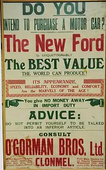 John F.O'Gorman completed his learning in London and was appointed by the Department of Agricultural and Technical Instruction, to teach the Theory of Road Carriage Building. He first traded as O'Gorman Bros, Address: 12 Wellington Street, Clonmel.[1] and advertised 'Motor Bodies of every description built on the premises'. They were special Agents for Austin, Humber and Ford cars. Shortly after the First World War, John F. O'Gorman went to Germany and captured the first main dealership in Ireland for Mercedes-Benz cars.