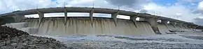 The O'Shaughnessy Dam is located on the Scioto River near Dublin, Ohio, United States. The dam forms O'Shaughnessy Reservoir, which is a major source of drinking water for the city of Columbus. It was completed in 1925 following recommendations of then superintendent Jerry O'Shaughnessy (for whom the dam was named).[2][3] At the time, the reservoir was described as "the finest inland waterway in the United States." Located 10 miles (16 km) upstream of the smaller Griggs Dam, it provides a large area for various forms of recreation in addition to its water supply duties. The reservoir holds 6.3 billion US gallons (24,000,000 m3) over a surface area of 845 acres (3.42 km2).[4] The Columbus Zoo and Aquarium is located on the east bank of the reservoir, near the dam.