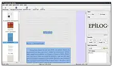 OCRFeeder has a simple graphical user interface that is designed to the GNOME Human Interface Guidelines. It performs a Document Layout Analysis and transfers the layout to capable output formats. It searches for content areas, outlines them and guesses the content type (text or image) and processes text areas through the OCR back-end. It can use virtually any command-line OCR engine as back-end and features auto-detection and auto-configuration for all popular free engines. OCR back-ends may be either auto-configured, the necessary command line entered in a GUI dialogue or configured directly via a XML file. Scan image post-processing including de-skewing can be done.[10] All recognition results can be reviewed and edited before saving to the desired output format. Sessions can be saved and loaded. The suite also includes a spell checker.[11] OCRFeeder has built-in procedures for the post-processing of the raw OCR results returned by the OCR engine. It can remove remaining segmentation to printed lines of text, even with removal of hyphenation.