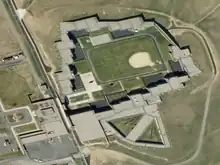 The prison is architecturally designed into the side of a hill to accommodate 481 inmates on a 160-acre (0.65 km2) site, which is connected by two corridors on separate levels. One of the corridors is used only for the staff, while the other corridor is used primarily for offenders and staff traffic, while the other 60 acres (0.24 km2) of this site are securely fenced in, with a large courtyard and baseball field in the center. Inmate cells measure 7 by 10 feet (2.1 by 3.0 m). Each cell contains a bed, table, toilet, and sink. The bed is a cement slab topped by a thin mattress. The toilet and sink are made of steel so they can't be broken. Each cell also has one rectangular window that's tall and thin. It is too narrow to escape through if the inmate could break the reinforced glass, and tests have proven it would take approximately twelve thousand hacksaw blades to cut through the steel bars of the prison. Not only does the prison provide a courtyard with a baseball field, but also includes an administration building, a religious resource room, gymnasium, security control center, staffed training fitness area, warehouses, a loading dock, and indoor firing range.