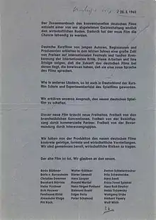 At the eighth festival in 1962, a group of young German filmmakers, among them Alexander Kluge, Peter Schamoni and Edgar Reitz, issued the Oberhausen Manifesto, pronouncing the "old" film dead and declaring their aspiration to create a new kind of German film.