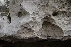 Formerly a geologic group, Ocala Limestone was downgraded to formation status by T.M. Scott in 1991.[1] The Ocala Limestone consists of almost pure limestones with occasional dolomites. It can be subdivided into both lower and upper facies with the lower facies composed of a whitish to cream-colored, fine to medium grained, poorly to moderately hard, fossil rich grainstone and packstone. The upper Ocala is white and somewhat weak and poorly sorted. Its extremely fossil rich grainstone, packstone and wackestone and some chert is common in the upper facies. Its permeable and transmissive properties allow it to form a vital portion of the Floridan Aquifer.
