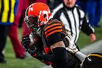 In Week 2 against the Bengals, Beckham caught four passes for 74 yards and his first receiving touchdown of the season during the 35–30 win.[152] In Week 4, against the Cowboys, he had five receptions for 81 receiving yards and two receiving touchdowns to go along with 73 rushing yards and a rushing touchdown in the 49–38 victory, amassing 154 total yards and 3 touchdowns on the day.[153] The rushing touchdown occurred late in the fourth quarter as the Browns were trying to stop a furious comeback attempt by the Cowboys. The touchdown helped put the Browns up by 11, effectively sealing the game.[154] In Week 7 against the Bengals, Beckham left the game in the first quarter with a knee injury and did not return after trying to tackle Darius Phillips following an interception.[155][156][157] The next day, it was revealed that Beckham suffered a torn ACL, prematurely ending his season.[158][159] He was placed on injured reserve on October 27, 2020.[160] Beckham finished the 2020 season with 23 catches for 319 yards and three receiving touchdowns plus three rushes for 72 yards and a rushing touchdown in seven games played.[161]