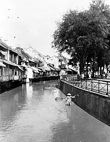 Avoiding the Qing government's suppression of the rebels, Oei left his first wife in China and fled in 1858 to Semarang, Central Java in the Dutch East Indies or today's Indonesia.[2][7] Aged only 23, Oei's Indonesian career began as a door-to-door peddler of diverse goods, from chinaware to rice.[7] Once financially independent, Oei married a locally-born Peranakan woman, Tjan Bien Nio (1839-1896), who came from a middle-class merchant family.[7] Together, the couple slowly built their business and had, among others, three sons: Oei Tiong Ham, Oei Tiong Bing and Oei Tiong Tjhian.[7][1] They also had four daughters: Siok Nio, Bok Nio, Thiem Nio and Koen Nio.[1] By a concubine, Oei also had a fourth son, Oei Tiong An.[1] Oei sent his sons to a traditional Chinese school, where they mostly learned the Chinese classics and some rudimentary arithmetics.[8][7]