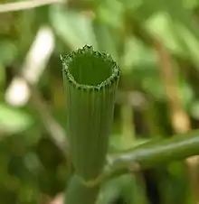Tubular water-dropwort is a hairless, stoloniferous perennial growing up to 80 cm tall with brittle, hollow, inflated cylindrical stems 0.5 cm in diameter, which are constricted at the nodes (hence the specific name fistulosa). Unlike some other water-dropworts, it has no swollen tubers among the roots, but it can reproduce vegetatively by the lengthy stolons.[1]