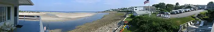 At what was then called Fish Cove, near the unnavigable Josias River, fishing was a major livelihood. But the cove was unprotected by a headland or breakwater from Atlantic storms, so fishermen had to protect their boats by hauling them ashore each night. Resolving to create a safe anchorage, they formed the Fish Cove Harbor Association, and dug a channel across land they purchased to connect Fish Cove with the Josias River. When the trench was complete, erosion helped to further widen the passage. The resulting tidewater basin is called Perkins Cove, spanned by a manually operated draw footbridge. With a three and a half-mile beach of pale sand and dunes forming a barrier peninsula, connected to the mainland in 1888 by bridge across the Ogunquit River, the village was discovered by artists. It became a popular art colony and tourist area. Particularly after 1898, when the Ogunquit Art Colony was established, it was not unusual to see both artists and fishermen working around Perkins Cove.[5] To accommodate summer crowds, several seaside hotels and inns were built. Marginal Way, a scenic trail dating back to the 1920s, runs along the coast from Perkins Cove to Ogunquit Beach.[6][7] Ogunquit seceded from Wells in 1980 and incorporated as a town. Ogunquit was named America's Best Coastal Small Town in USA Today's 10 Best Readers' Choice 2016.[8]