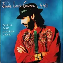 Ojala Que Llueva Cafe (English "Hope That It Rains Coffee") is the lead single by the Dominican artist Juan Luis Guerra and his band 4:40 from their fourth studio album of the same title. It was released on 1989 by Karen Records and 1990 in Europe by Ariola Records. The lyrics are a poetic metaphor about the poor conditions of the hard-working people residing in the countryside and the hope that the things are going be better someday in the future.[1] Is one of Guerra’s signature songs and one of the first tracks to gain international attention in his career, peaking on the Billboard Hot Latin Tracks and Latin America airplay charts. The music video was ranked number one of the top 15 best music videos of all time by Dominican artists.[2]