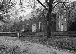 In the 1770s, Presbyterian settlers from Scotland and Ireland built a log church. This was replaced by a brick church on the Little River in 1788. This church is a simple, rectangular, brick building with a gabled roof. The bricks were handmade by members of the congregation. The church has straight-back, wooden pews. There is a dais pulpit against the east wall that is three steps above floor level. The dais has a bible stand and has rails on the two sides. On the west end, there is a slave gallery. In 1852, a stone wall was built around the church and cemetery.[3][4][6][7][8]