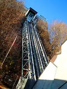 The Old Quebec Funicular (French: Funiculaire du Vieux-Québec) was a funicular railway, later converted as an inclined elevator, in the Old Quebec neighbourhood of Quebec City, Quebec, Canada. It links the Haute-Ville (Upper Town) at Dufferin Terrace to the Basse-Ville (Lower Town) at Rue du Petit-Champlain. The Basse-Ville includes such sites as the colonial-era Notre Dame des Victoires church, the historic Petit Champlain district, the port, and the Musée de la civilisation (Museum of Civilization). Climbing at a 45-degree angle, the railway covers a total distance of 64 metres (210 ft).[1]