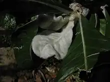 Oldenburgia grandis is a shrub or small, gnarled tree in the family Asteraceae. It occurs in the mountains around Grahamstown in South Africa. It grows to a height of about 5m on sandstone outcrops. It has thick corky bark and large leaves clustered at the ends of branches. The leaves are dark green and leathery, reminiscent of loquat leaves, but generally a good deal larger. The emergent leaves are densely and completely felted with white hair. Most of the felt is lost as the leaf matures, but some persists on under-surfaces. Flowers are white or purplish and borne in large heads some 5- to 12 cm in diameter. The flowerheads are terminal; The same plant may bear solitary heads, plus heads borne in loose, irregular panicles. It is threatened by habitat loss.
