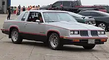 The first Hurst/Olds was the 1968 Hurst/Olds. It shared its body with the regular Oldsmobile Cutlass and 442, but had a unique Peruvian Silver and Black paint scheme. The Hurst/Olds was powered by a 390 hp (395 PS; 291 kW) @ 5000 rpm and a maximum torque of 500 lb⋅ft (678 N⋅m) @ 3200 rpm, 308° duration cam W-45 (without A/C) or 285/287° duration cam W-46 (with A/C), with a displacement of 455 cu in (7.5 L) Rocket V8, equipped with a single 4-barrel Rochester Quadrajet 4GC carburetor.[1][2] This engine was similar to the 400 hp (406 PS; 298 kW) W-34 455 engine offered in the Toronado and the 390 hp (395 PS; 291 kW) W-33 455 option available on the full-sized Delta 88. The W-45 and the milder W-46 engines differed in camshaft and cylinder head selection. The 455 was mated to a code OW three-speed Turbo-Hydramatic 400 transmission with console-mounted Hurst Dual-Gate shifter that permitted automatic or manually ratcheted shifting.[3]
