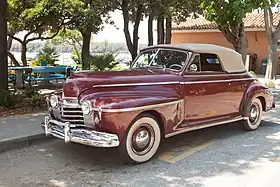 The Series 60 "Special" is a full-size car made by Oldsmobile from the 1939 through the 1948 model years. It was their entry-level model using the GM "A" body platform, giving Oldsmobile an entry level product with more standard features that would be optional on Chevrolet and Pontiac vehicles using the same platform. Initially, the engine size used was the company's flat head 6 cylinder, while senior models would use the flat head 8 cylinder. For marketing purposes, the Oldsmobile Series 60, or the Oldsmobile 66, took advantage of the national highway U.S. Route 66 established in 1926.[1] It was with this generation that all GM vehicles experienced increased width dimensions to accommodate three passengers on the front bench seat and an additional three passengers on rear bench seat installed vehicles. This was accomplished with the deletion of running board thereby adding additional room inside the passenger compartment and upgrading the floor mounted gearshift to a steering column installed transmission gear selector for the Hydramatic automatic transmission.[1]