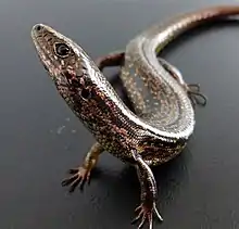 Kapitia skinks reach sexual maturity relatively slowly, at about 4 years of age, and give birth in late summer, around February (like all but one of New Zealand's native skinks, they bear live young rather than lay eggs).[7][10] One of the skinks captured in 2018 and sent to Auckland Zoo subsequently gave birth to five young.[13] These skinks primarily hunt invertebrates, but may have fed on berries before the coastal forest was cleared.[10] They are diurnal, basking in the sun but quickly hiding if disturbed.[7]