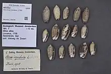 | Shell specimens of Oliva oliva at the Naturalis Biodiversity Center, showing variations in color and pattern | |