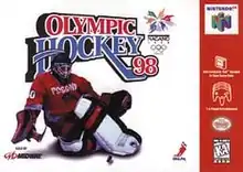 Olympic Hockey '98 is an ice hockey game for the Nintendo 64 that was released in 1998. It is a re-release of Wayne Gretzky's 3D Hockey '98, but this time not endorsed by Wayne Gretzky and featuring the license for the 1998 Winter Olympics that were celebrated in Nagano, Japan. It was the video game developer debut of Treyarch.[1] Besides the box art, in-game titles, and some minor graphic changes (such as team logos and colors), every single aspect of the game is practically identical to Wayne Gretzky's 3D Hockey '98. Due to this fact, it received highly negative reviews, with IGN rating Olympic Hockey Nagano '98 a zero.[2]