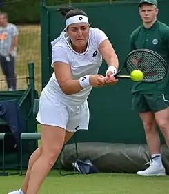 In London, she reached her second consecutive Wimbledon quarterfinal, defeating Mirjam Björklund, Katarzyna Kawa, Diane Parry and 24th seed Elise Mertens. Defeating Marie Bouzková in the quarterfinal, she became the first Arab or North African woman ever to reach the semifinals of a major tournament.[74][75][76] After that, she defeated Tatjana Maria to reach her maiden Grand Slam final, which made her the first African woman, and the first Arab or North African player, in the Open era to enter a Grand Slam singles final.[77][78] In the final, she lost to Elena Rybakina in three sets. Despite this, Wimbledon did not receive points due to athletes representing Russia and Belarus being banned from the tournament because of Russia's invasion of Ukraine.[79]