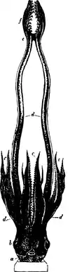 Most species belonging to the genus have a mantle length of under 200 mm, however the larger members may measure over 300 mm.[2] The species in this genus have a densely muscular, cylindrical mantle which is tapered posteriorly into a pointed tail. Their skin is smooth and has no warts or wrinkles. The gladius can be seen through the skin along the midline of the back. The fins are rhomboid in shape, heart shape or arrow shaped and are pointed posteriorly. The species of Onychoteuthis have 8-10 prominent nuchal folds. Their tentacular clubs have 2 central series of 19-27 large, strong hooks on their manus and the adults either have no lateral sucker series no marginal series of suckers. or they are vestigial. The chitinous rings of the suckers on the arms is smooth, with no teeth. They have photophores in their mantle cavity with a small one placed anteriorly on the ink sac, another near the anus; a large one placed posteriorly on the intestine and a bilobed photophore located on the ventral surface of each eye.[3]