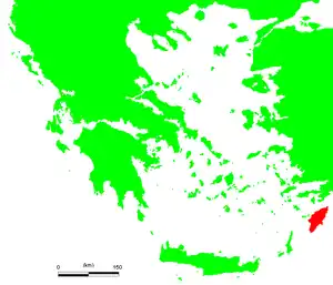 ![]() Map of Greece, the Greek Islands and Turkey Rhodes is highlighted in red | |||||||