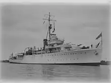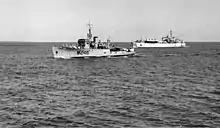 They were augmented by RAN vessels, designated Task Group 308.2. The sloop HMAS Warrego and boom defence vessel Karangi carried out a hydrographic survey of the Montebello Islands, laying marker buoys for moorings. Care had to be taken with this, as Operation Hurricane had left some parts of the islands dangerously radioactive. The corvettes HMAS Fremantle and HMAS Junee provided logistical support, ferried personnel between the islands and the mainland, and accommodated 14 Australian and British media representatives during the first test. They were replaced by Karangi for the second test. A pair of RAN 120-foot (37 m) motor lighters, MWL251 and MRL252, provided water and refrigeration respectively.[30][32][33] The two barges were visited by the First Sea Lord, Admiral Lord Mountbatten, and Lady Mountbatten, who flew out to the islands on a Whirlwind helicopter on 15 April.[34][35]
