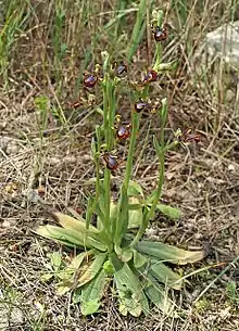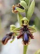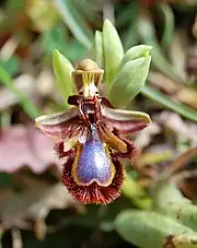 Ophrys speculum, the mirror orchid, is a species of Ophrys distributed throughout the Mediterranean that is pollinated exclusively by a single species of scoliid wasp.