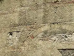 Opus reticulatum (also known as reticulate work) is a facing used for concrete walls in Roman architecture from about the first century BCE to the early first century CE.[1]:136–9 [notes 1] They were built using small pyramid shaped tuff, a volcanic stone embedded into a concrete core.[2]:75–6[3] Reticulate work was also combined with a multitude of other building materials to provide polychrome colouring and other facings to form new techniques.[4]:260–4[5]:189 Opus reticulatum was generally used in central and southern Italy with the exception being its rare appearance in Africa and Jericho.[1]:175[5]:189 This was because of tuff's wider availability and ease of local transport in central Italy and Campania compared to other regions.[2]:73–4[5]:189