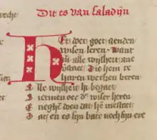 Outside of France, the Ordene was most influential in Italy. It is paraphrased in a cycle of sonnets by Folgore da San Gimignano and the tale is incorporated into three Italian prose works: Bosone da Gubbio's Fortunatus Siculus, Anton Francesco Doni's Novelle and the Novellino. There is also a Middle Dutch version by Hein van Aken, entitled Van den Coninc Saladijn ende van Hughen van Tabaryen. This version includes the Franco-Picard prologue (which differs from the Anglo-Norman).[21] It is preserved in three manuscripts.[22] The Dutch prose work D'ystorie van Saladine printed by Arend de Keysere around 1480 merely contains the character of Hugh of Tiberias but is otherwise unrelated to the Ordene.[21]