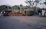O&K delivered several types of cogwheel locomotives for mixed railways, on which ordinary operation alternated with cogwheel operation. Mixed railways were used in changing terrains with only single steep gradient, which could not be negotiated by ordinary adhesion locomotives. Accordingly, only these steep gradients were equipped with toothed bars. The mode of operation was as follows: The two steam cylinders outside the frame drove the driving gearwheel for the rack by means of a double gearing with the appropriate transmission. This driving gear wheel sat on a special axle fixed in the frame and was connected to the friction axles by coupling rods, so that the gear wheel axle and friction axles were driven simultaneously. The locomotives could therefore run on normal rail tracks as well as on toothed tracks. On the toothed track, the driving gear and the friction wheels worked together. The effect of the latter was also utilised on the toothed track and the load on the rack was relieved accordingly. The locomotives worked either on a simple flat steel rack or on Riggenbach ladder rack.[16] A cumulative number of only 6 to 9 rack steam locomotives were made by O&K in total. Their track gauge ranged from 400 mm (15+3⁄4 in) to 1,300 mm (4 ft 3+3⁄16 in).[17]
