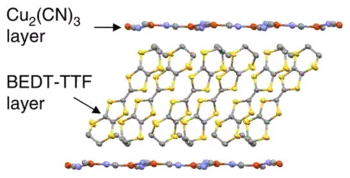 - ↑ Komatsu, Tokutaro; Matsukawa, Nozomu; Inoue, Takeharu; Saito, Gunzi (1996). "Realization of Superconductivity at Ambient Pressure by Band-Filling Control in κ-(BEDT-TTF)2 Cu2(CN)3". Journal of the Physical Society of Japan. 65 (5): 1340–1354. doi:10.1143/JPSJ.65.1340.