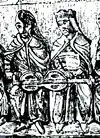 The organistrum appears on a bas-relief from the abbey of St Georges de Boscherville (11th century), preserved in the Rouen museum. A royal lady plays it while her maid turns the crank. It has the place of honour in the centre of the band of musicians representing the twenty-four elders of the Apocalypse in the tympanum of the Gate of Glory of the cathedral of Santiago de Compostela (12th century). A fine example appears in a miniature of a psalter of English workmanship (12th century), forming part of the Hunterian collection in Glasgow University.[5]