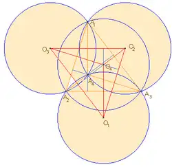 Orthocentric system. Where O1, O2, O3, O4 are the circumcenters of the four possible triangles formed from the orthocentric points A1, A2, A3, A4.
