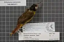 - 1 2 BirdLife International (2016). "Orthotomus samarensis". IUCN Red List of Threatened Species. 2016: e.T22715006A94436064. doi:10.2305/IUCN.UK.2016-3.RLTS.T22715006A94436064.en. Retrieved 12 November 2021.