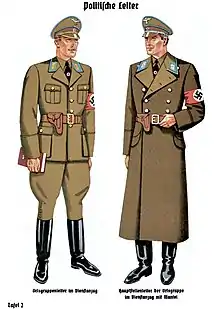 Ortsgruppenleiter (Local Group Leader) was a Nazi Party political rank and title which existed between 1930 and 1945. The term first came into being during the German elections of 1930, and was held by the head Nazi of a town or city, or in larger cities, of a neighbourhood, for the purposes of election district organization. After 1933, through the process of Gleichschaltung, the position of Ortsgruppenleiter evolved into the Nazi leader of a large town or city or of a city district.[1]