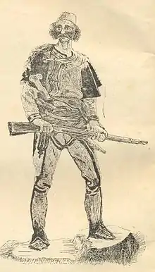 Oso Kuka himself had formed a 24-man band (çetë) that was active in the city.[7] At the head of a small group, Oso Kuka arrived on the battlefield where 8,000 Montenegrin soldiers had been besieging the fort of Vranjina. Kuka and his group were defending a secondary tower in front of the main tower. When it was surrounded, instead of surrendering, Kuka planted explosives in the tower. He then activated them when the tower was stormed by the Montenegrins, thereby killing hundreds of Montenegrin soldiers along with his group.[6] His bravery made it possible for Vranina to stay under Albanian control until 1879, when it was ceded to Montenegro by the Congress of Berlin.