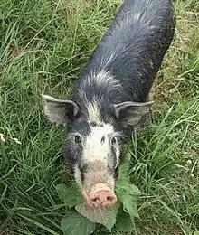 Aside from the environmental concerns posed by Ossabaw Island hogs, they are also recognized as a unique genetic resource by scientists and breed conservationists. They are thought to be the only U.S. breed which is descended from the Iberian-type pigs brought to North America by the Spanish.[4] A very small breeding population of Ossabaw hogs are kept off the island by farmers who market them as a form of heritage pork, and there are also herds at several zoos and farms, at Mount Vernon, Colonial Williamsburg, National Colonial Farm at Piscataway Park in Accokeek, Maryland,[5] Conner Prairie Interactive History Park in Fishers, Indiana, and Barrington Living History Farm in Washington, Texas. Captive breeding populations were also previously kept by a few American universities for scientific study and conservation, but these herds were dissolved and have not contributed to the current bloodlines of Ossabaw hogs on the mainland today.[6]