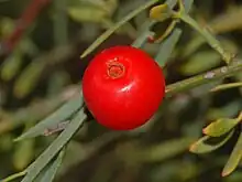 Osyris alba is a semiparasitic (hemiparasitic) broom-like shrub reaching 30–150 cm (12–59 in) in height.[1] The stem is woody, brown or dark green, sometimes creeping on the ground. This plant has numerous longitudinally striated branches, green when young. The leaves are linear, lanceolate, coriaceous, and persistent, although sometimes deciduous. They are about 15–35 mm (0.59–1.38 in) long and 1–5 mm (0.039–0.197 in) wide.[1] They are produced during the winter, while in summer they are almost totally absent.[1] The flowers are hermaphroditic or unisexual; in the latter case, the male and female flowers show differences associated with the timing of pollination. They are very small (1 or 2 mm), with four yellow-green tepals and four stamens. Flowering period extends from March to June.[1] The fruits are small, red, fleshy drupes, 4–6 mm (0.16–0.24 in) in diameter. Their roots form haustoria that tap into the roots of nearby plants and extract their sap.