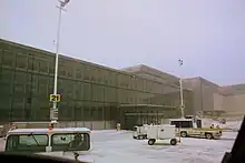 During the 1950s, while the airport was still named Uplands and a joint-use civilian/military field, it was the busiest airport in Canada by takeoffs and landings, reaching a peak of 307,079 aircraft movements in 1959,[9] nearly double its current traffic. At the time, the airport had scheduled airline flights by Trans-Canada Air Lines (Toronto, Montreal, and Val-d'Or), Trans Air (Churchill), and Eastern Air Lines (New York via Syracuse and Washington via Montreal).[9] With the arrival of civilian jet travel, the Canadian government built a new field south of the original one, with two much longer runways and a new terminal building designed to handle up to 900,000 passengers/year. The terminal building had been scheduled to open in 1959, but during the opening ceremonies, a United States Air Force F-104 Starfighter went supersonic during a low pass over the airport, and the resultant sonic boom shattered most of the glass in the airport (including the entire north wall) and damaged ceiling tiles, door and window frames, and even structural beams.[10] As a result, the opening was delayed until April 1960. The original terminal building and Trans-Canada Airways/DOT hangar continued in private use on the airport's north field until the fall of 2011 when it was demolished.