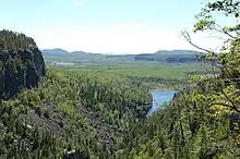 Ouimet Canyon is a large gorge in the municipality of Dorion, Thunder Bay District in northwestern Ontario, Canada,[1] about 60 kilometres (37 mi) northeast of the city of Thunder Bay. The gorge is 100 metres (330 ft) deep, 150 metres (490 ft) wide and 2,000 metres (2.0 km; 1.2 mi) long, protected as part of Ouimet Canyon Provincial Park.