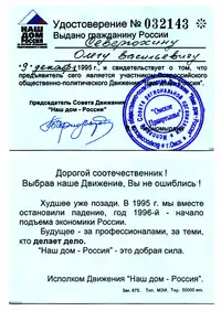 Although it was critical of the war in Chechnya, Viktor Chernomyrdin and NDR played a central role in supporting Yeltsin in his 1996 bid for re-election as President of the Russian Federation. "To sum up why Our Home – Russia is for Yeltsin, I can say only one thing--because we are for reforms, for the constitution of Russia, for peace in Chechnya, for a normal life in Russia," Chernomyrdin told ITAR-TASS news agency in 1996.