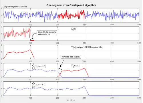 (Overlap-add algorithm for linear convolution) h = FIR_filter M = length(h) Nx = length(x) N = 8 × 2^ceiling( log2(M) ) (8 times the smallest power of two bigger than filter length M. See next section for a slightly better choice.) step_size = N - (M-1) (L in the text above) H = DFT(h, N) position = 0 y(1 : Nx + M-1) = 0 while position + step_size ≤ Nx do y(position+(1:N)) = y(position+(1:N)) + IDFT(DFT(x(position+(1:step_size)), N) × H) position = position + step_size end