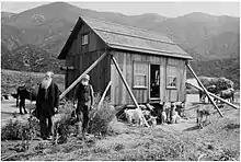 The first cabin of Owen (left) and Jason Brown, near Altadena, California. The beams protect from the winds high on the hill. This cabin was destroyed by fire in 1888.[42]