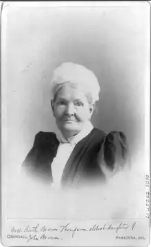 Pasadena was sympathetic to the memory of John Brown; it was a Republican city, settled by immigrants from Indiana.[48][25]:22 Owen, Jason, and to a lesser extent Ruth and her husband were treated as celebrities,[49] the men "eccentric and charming".[25]:25 However, Owen "suffered from the celebrity which his adventures and his father's fame gave him; and this was one reason why be retired with his brother to a remote cabin, where, nevertheless, sight-seers and importunate friends followed him, and left him very little of that solitary leisure which he so much valued."[16] A different source says the brothers "delighted in having callers";[6] yet another, that they were guides for tourists.[50] "They were much visited by tourists and citizens, some from mere curiosity and other[s] from a warm sympathy with the heroic career of the family."[51] They were "often" visited by the naturalist Charles Frederick Holder, who talked with them about their experiences and the Underground Railroad.[52] According to one report, "it was difficult to get Owen to speak of the tragic events of his life",[6] but another says that "to listen to his recital of their escape was as thrilling and much more interesting than stories of the most daring of fictitious heroes."[50] "Owen Brown had related to his sister Ruth all the particulars of the expedition to the South with a colored man named Green, and she will publish this with many valuable memorandas of her father not yet printed";[37] this publication never took place.