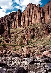 The Owyhee River is a tributary of the Snake River located in northern Nevada, southwestern Idaho and southeastern Oregon in the United States. It is 280 miles (450 km) long.[2][4] The river's drainage basin is 11,049 square miles (28,620 km2) in area, one of the largest subbasins of the Columbia Basin.[5] The mean annual discharge is 995 cubic feet per second (28.2 m3/s), with a maximum of 50,000 cu ft/s (1,400 m3/s) recorded in 1993 and a minimum of 42 cu ft/s (1.2 m3/s) in 1954.[6]